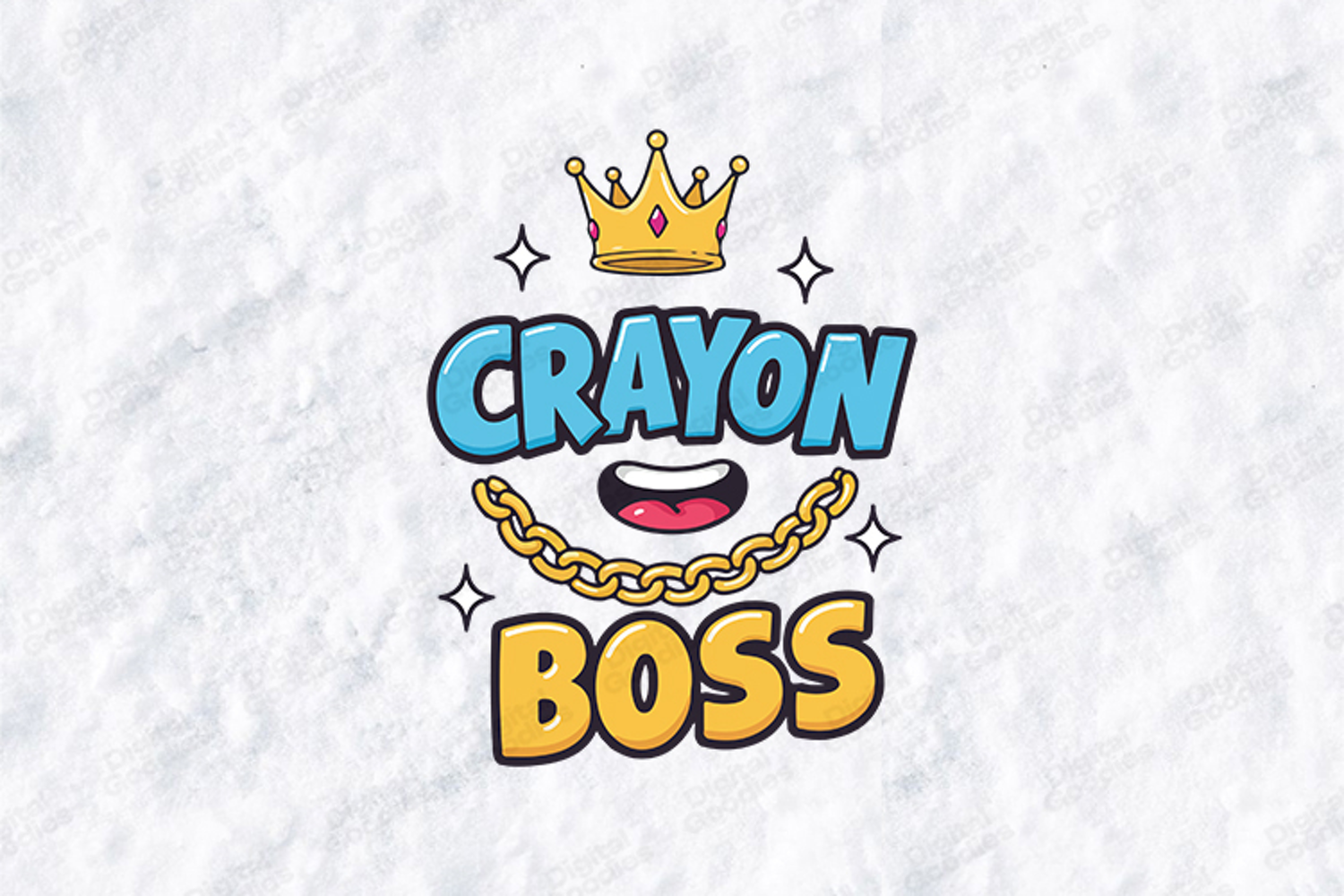 Rule the classroom with the "Crayon Boss" typography design. This high-quality digital illustration features a bold, multi-colored layout with "Crayon" in bright blue and "Boss" in vibrant yellow. Centered around a smiling face wearing a gold crown and a chunky gold chain, and accented by playful sparkles, this design is perfect for creating professional student t-shirts, personalized school supply decals, and fun classroom posters with the included high-resolution SVG, PNG, and JPG files.