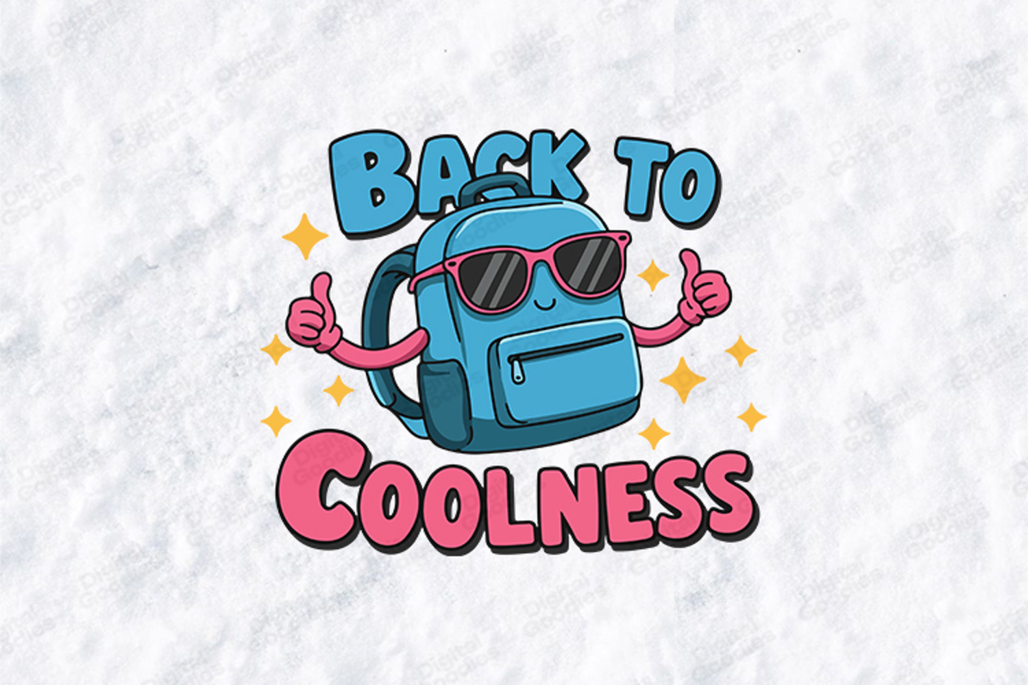 Show off your academic style with the "Back To Coolness" design. This high-quality digital illustration features a cheerful, anthropomorphic blue backpack character wearing pink sunglasses and giving two thumbs up. Surrounded by vibrant pink and blue typography and accented with yellow and teal stars, this playful design is perfect for creating professional student t-shirts, personalized bag decals, and fun classroom posters with the included high-resolution SVG, PNG, and JPG files.