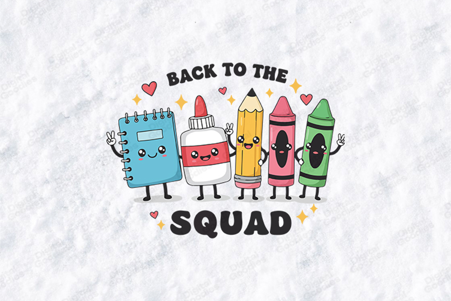 Gather your academic crew with the adorable "Back To The Squad" design. This high-quality digital illustration features a cheerful line-up of anthropomorphic school essentials, including a blue notebook, a glue bottle, a yellow pencil, and pink and green crayons, all giving peace signs.