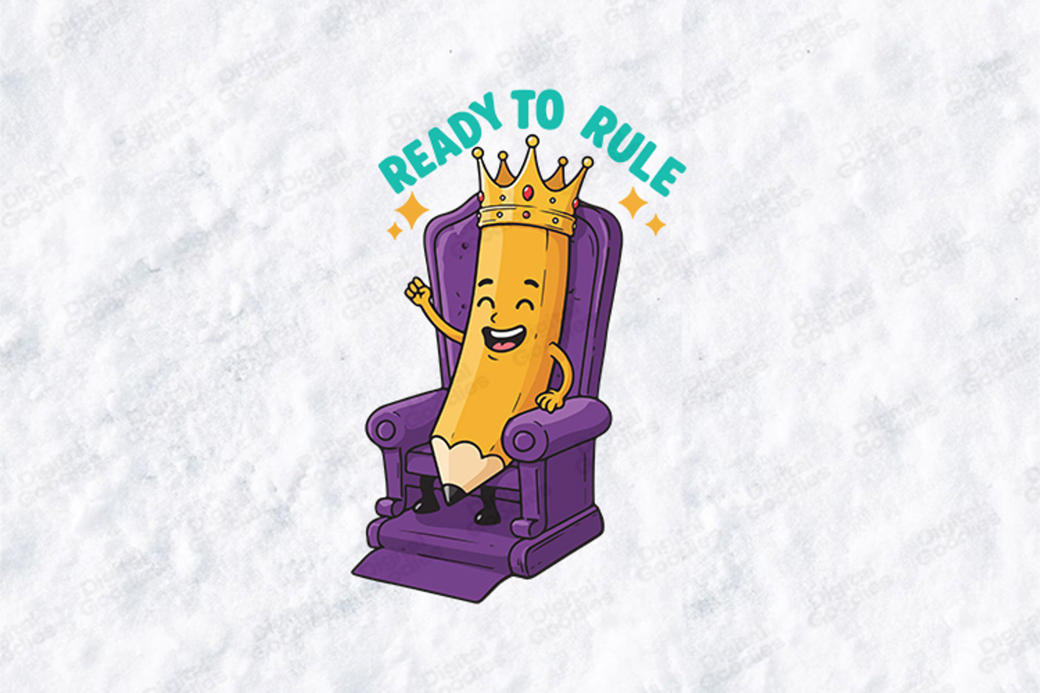 Take charge of the new school year with the "Ready To Rule" design. This high-quality digital illustration features a charismatic, anthropomorphic yellow pencil character sitting on a plush purple throne and wearing a golden crown.