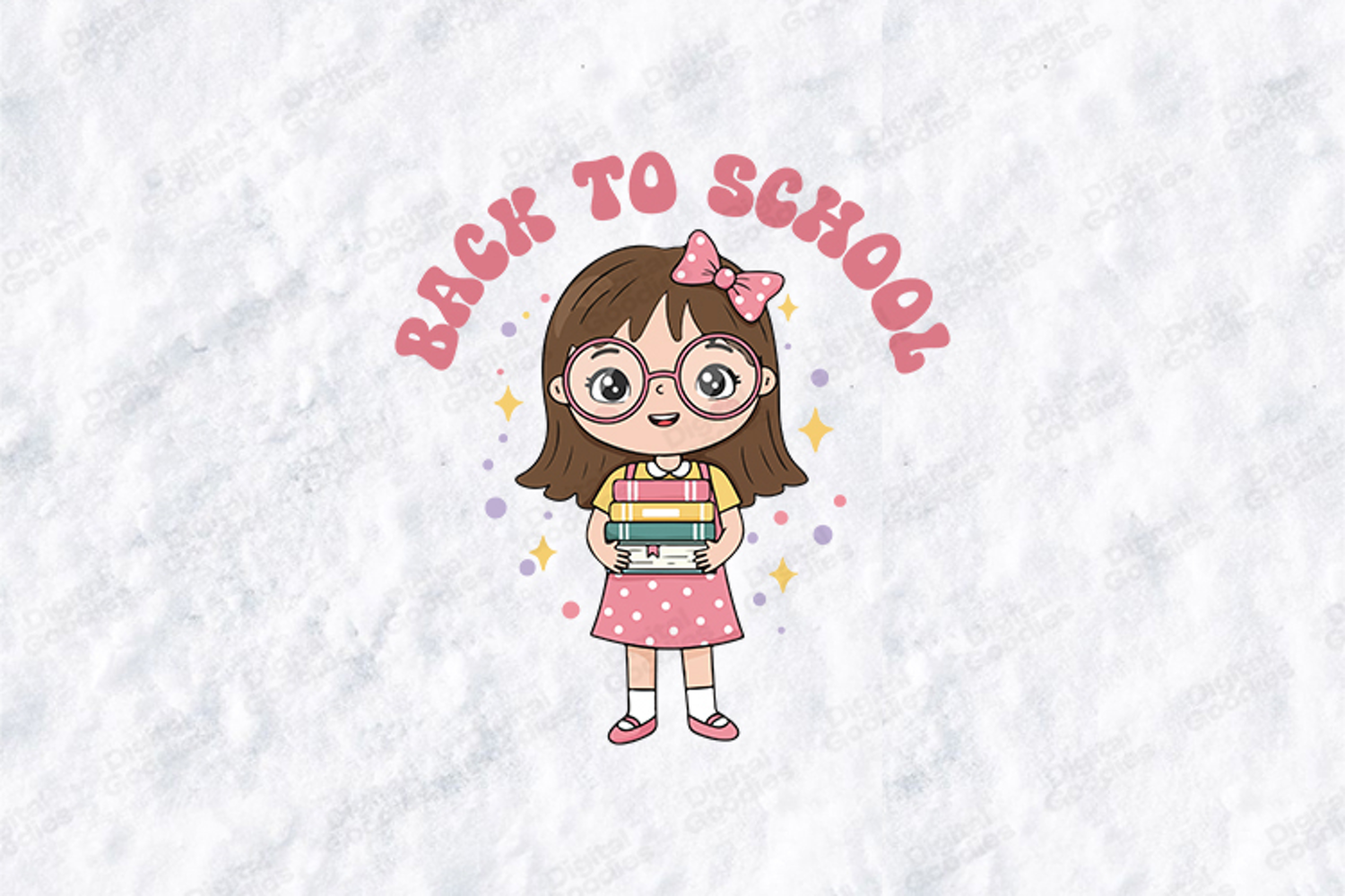 Step into the new school year with the "Back To School" girl character design. This high-quality digital illustration features a charming, anthropomorphic girl character with brown hair, wearing pink round glasses and a pink polka-dot bow.