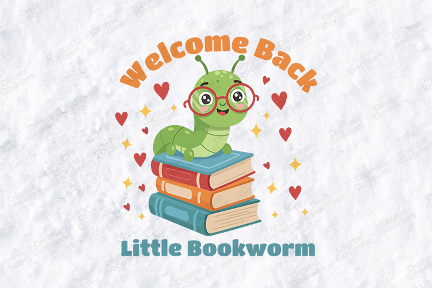 Celebrate a love for reading with the "Welcome Back Little Bookworm" design. This high-quality digital illustration features a charming, anthropomorphic green caterpillar wearing large red round glasses.