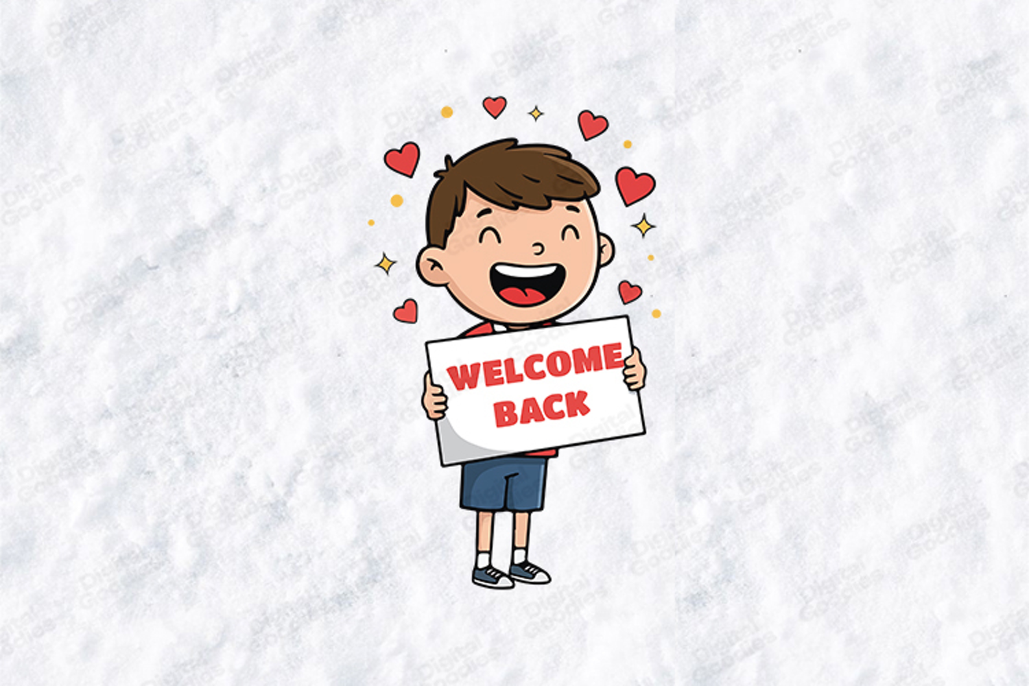 Greet your students with enthusiasm using the "Welcome Back" boy character design. This high-quality digital illustration features a cheerful, anthropomorphic young boy character with brown hair, expressing pure joy with a wide, open-mouthed smile.