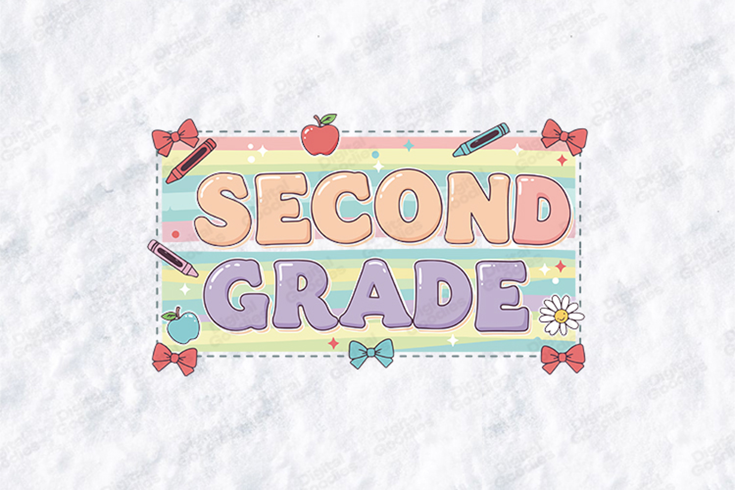 The design showcases the words "Second Grade" in bold, bubbly peach and lavender typography set against a soft, rainbow-striped background. The composition is framed with a dashed border and decorated with classic classroom icons, including dainty red and blue bows, shiny red apples, colorful crayons, and a cheerful white daisy. This design is perfect for creating professional second-grade teacher t-shirts, personalized student stationery, and aesthetic classroom displays with the included high-resolution SVG, PNG, and JPG files.