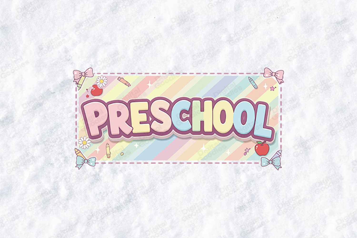 The design showcases the word "Preschool" in bold, bubbly pink and blue typography set against a soft, diagonal rainbow-striped background. The composition is framed with a delicate stitched border and adorned with classic early childhood icons, including dainty pink and blue bows, shiny red apples, colorful crayons, and cheerful white daisies. This design is perfect for creating professional preschool teacher t-shirts, personalized student tote bags, and aesthetic classroom signage with the included high-resolution SVG, PNG, and JPG files.