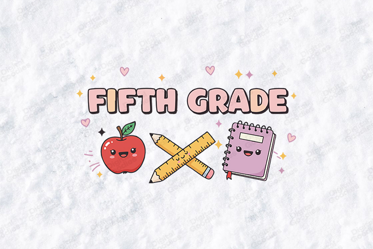 The design showcases the text "FIFTH GRADE" in bold, rounded typography using shades of pink, peach, and lavender. Below the text, three charming icons come to life: a smiling red apple, crossed yellow pencils, and a happy pink spiral notebook. Accented with delicate pink hearts and golden stars, this design is perfect for creating professional fifth-grade teacher t-shirts, graduation gifts, and cute classroom decor with the included high-resolution SVG, PNG, and JPG files.