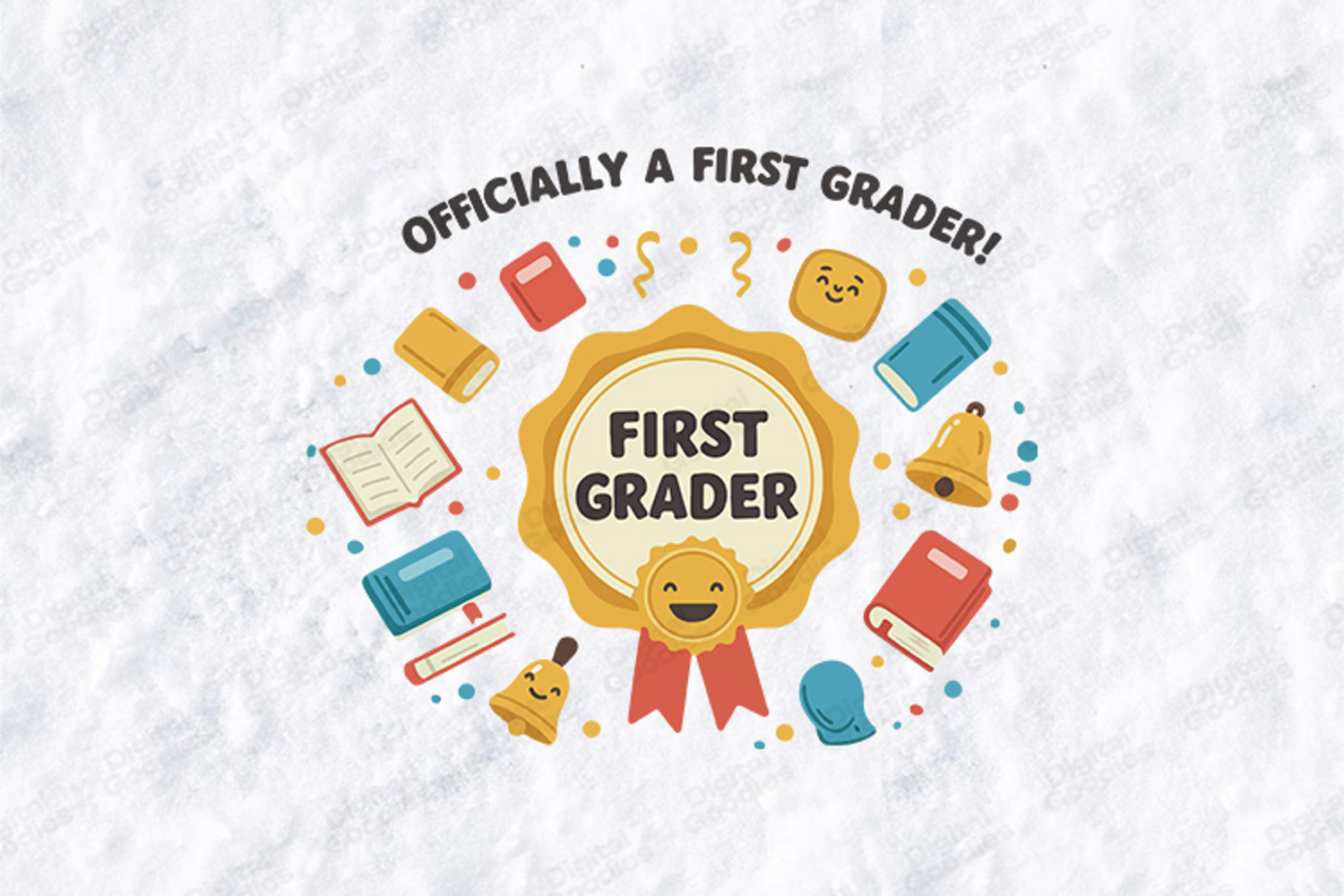 The design features the proud declaration "OFFICIALLY A FIRST GRADER!" arched over a prominent, golden achievement seal. The central medal includes a cheerful, smiling face and vibrant red award ribbons. Surrounding the medal is a whimsical wreath of school-themed icons, including colorful books, open notebooks, golden bells, and celebratory confetti. This design is perfect for creating professional first-grade spirit wear, personalized student certificates, and celebratory classroom decor with the included high-resolution SVG, PNG, and JPG files.