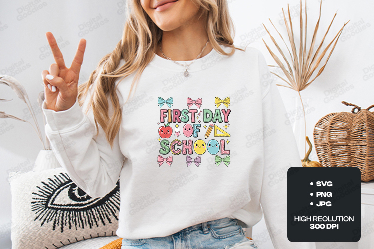 The design showcases the phrase "FIRST DAY of SCHOOL" in playful, patterned bubbly typography. The "O" in "School" is uniquely represented by three smiling kawaii characters: a pink donut, a yellow emoji face, and a blue egg-shaped character. The composition is framed by a border of colorful pastel bows in shades of blue, pink, and yellow. Charming school icons, including a smiling red apple, a yellow pencil, and a yellow ruler, accent the center of the design alongside shimmering golden stars. This design is perfect for creating professional "first day" student t-shirts, personalized teacher tote bags, and cheerful classroom decor with the included high-resolution SVG, PNG, and JPG files.