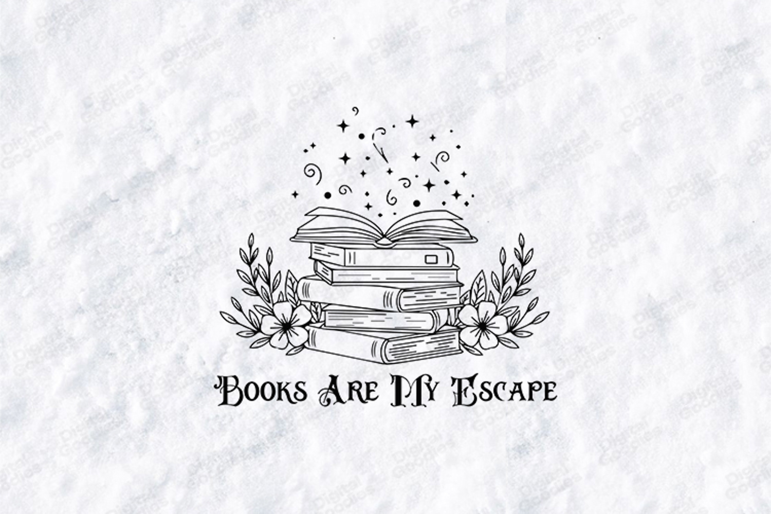 The design showcases an open book resting atop a tall stack of vintage hardcovers. Ethereal swirls of magic, shimmering stars, and delicate sparkles rise from the open pages, symbolizing the transformative power of reading. The illustration is beautifully framed by blooming flowers and elegant leafy vines on either side. The phrase "BOOKS ARE MY ESCAPE" is displayed below in a sophisticated, ornate serif typography. This design is perfect for creating professional book-themed t-shirts, personalized reading nook decor, and enchanting library tote bags with the included high-resolution SVG, PNG, and JPG files.