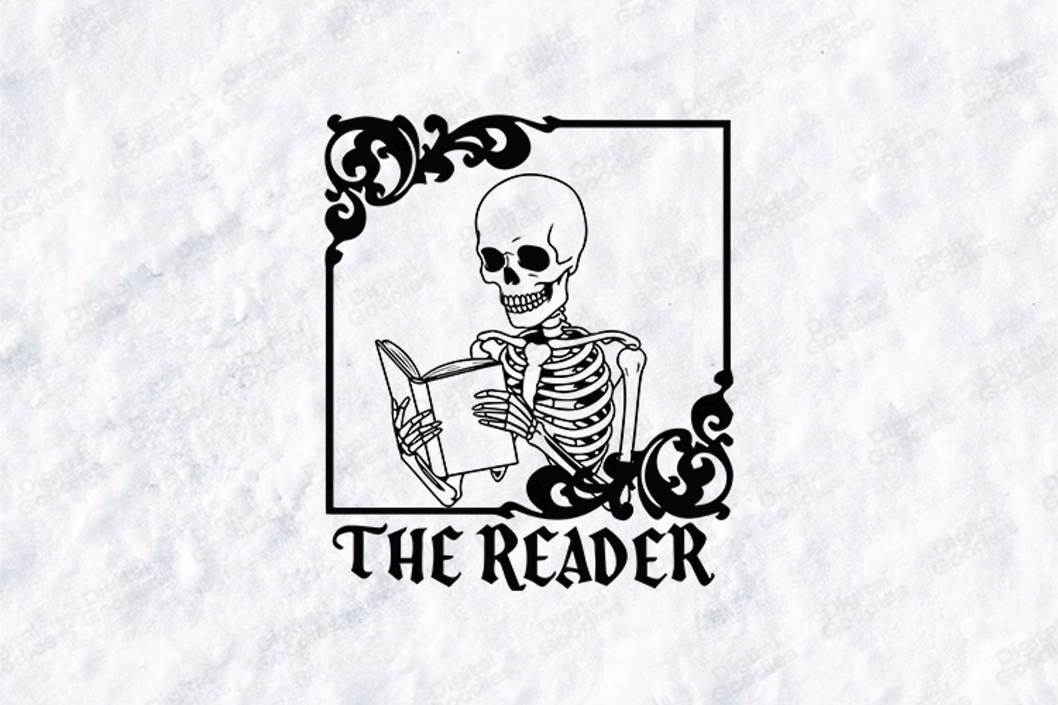 The design showcases a detailed skeleton character holding an open book, captured in a moment of deep focus. The illustration is partially enclosed by an elegant, open-corner rectangular frame featuring bold, Victorian-style scrollwork and decorative flourishes. The title "THE READER" is displayed at the base in a sharp, professional gothic typography. This design is perfect for creating professional book-themed t-shirts, personalized library tote bags, and refined reading nook wall art with the included high-resolution SVG, PNG, and JPG files.
