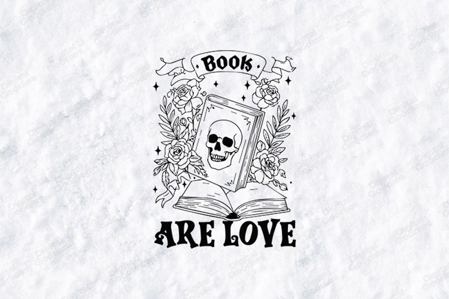 The design showcases a detailed skull centered on the cover of a vintage hardcover book, which rests atop another wide-open volume. The central imagery is lushly framed by blooming roses and detailed leafy vines, blending macabre elements with romantic botanical beauty. The phrase "BOOK ARE LOVE" frames the illustration, with "BOOK" displayed on an ornate ribbon banner at the top and "ARE LOVE" grounded at the base in a bold, professional gothic typography. This design is perfect for creating professional book-themed t-shirts, personalized library tote bags, and refined reading nook decor with the included high-resolution SVG, PNG, and JPG files.