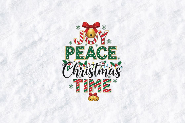 The design showcases a vibrant typography stack utilizing classic holiday patterns. The word "JOY" features a red and white candy cane stripe, while "PEACE" is rendered in a jolly green and white polka-dot style. The phrase is topped with a golden bell tied with a classic red bow and accented by green snowflakes. A festive string of colorful holiday lights and holly sprigs with red berries separates the top words from the elegant script of "Christmas," which is grounded by "TIME" in diagonal red and green stripes. This design is perfect for creating professional holiday t-shirts, festive sweatshirts, and joyful home decor with the included high-resolution SVG, PNG, and JPG files.