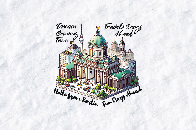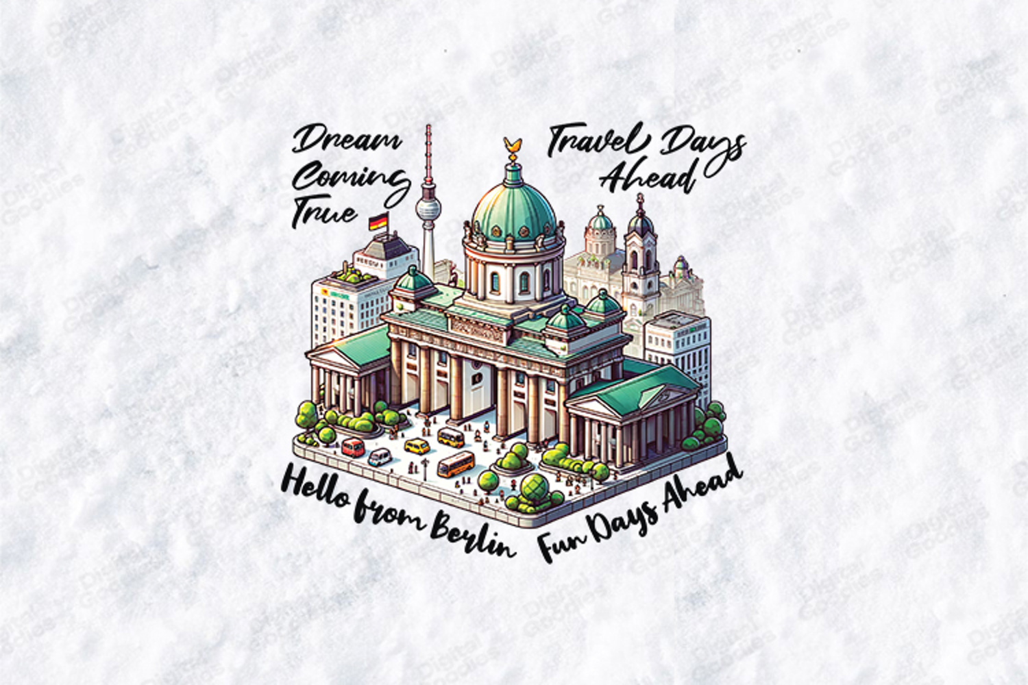 This high-quality illustration features famous Berlin landmarks, including the iconic Berlin Cathedral (Berliner Dom) and the TV Tower (Berliner Fernsehturm). With phrases like "Hello from Berlin" and "Dream Coming True," it is the perfect digital asset for travelers and creators looking to capture the spirit of this historic city.