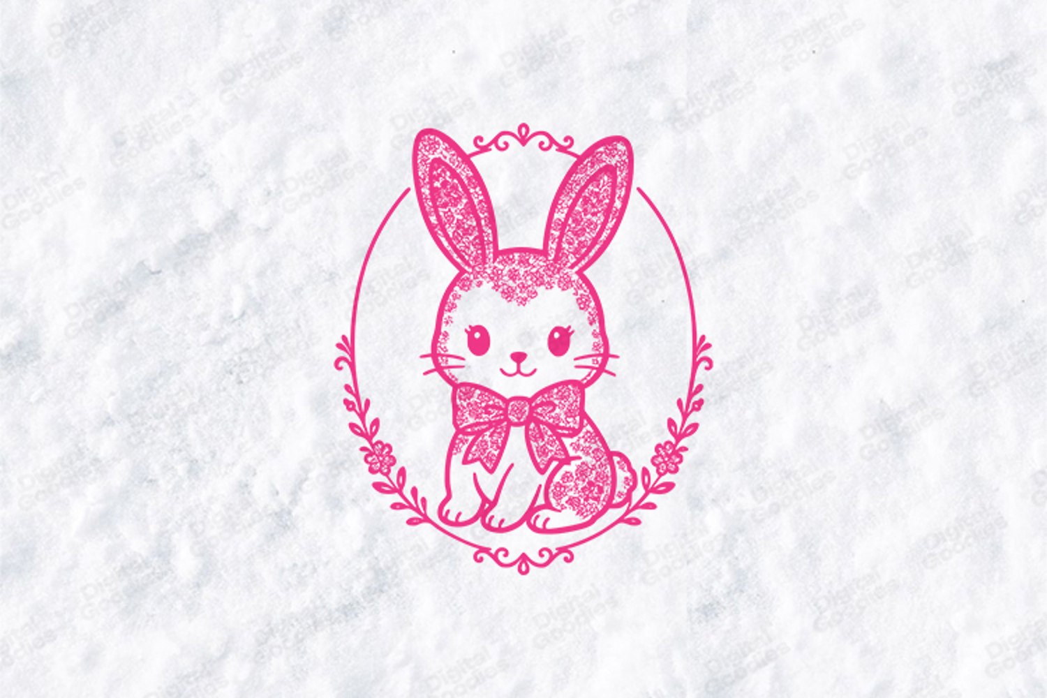 This high-quality digital illustration features a charming, patterned bunny rabbit adorned with a delicate floral bow and a tiny heart accent. Encased in an elegant floral oval frame, this design perfectly captures the popular "coquette" aesthetic with a classic monoline twist, making it a must-have for your spring collection.