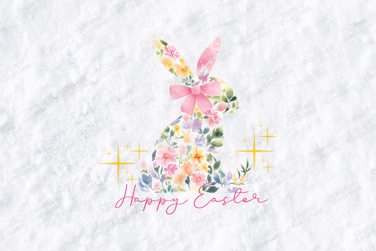 This high-quality digital illustration features a sweet sitting bunny silhouette composed of delicate, hand-painted style wildflowers and greenery. Accented with a soft pink coquette bow and golden sparkles, it is perfect for creators looking for a modern, feminine, and high-end look for their Easter holiday crafts.