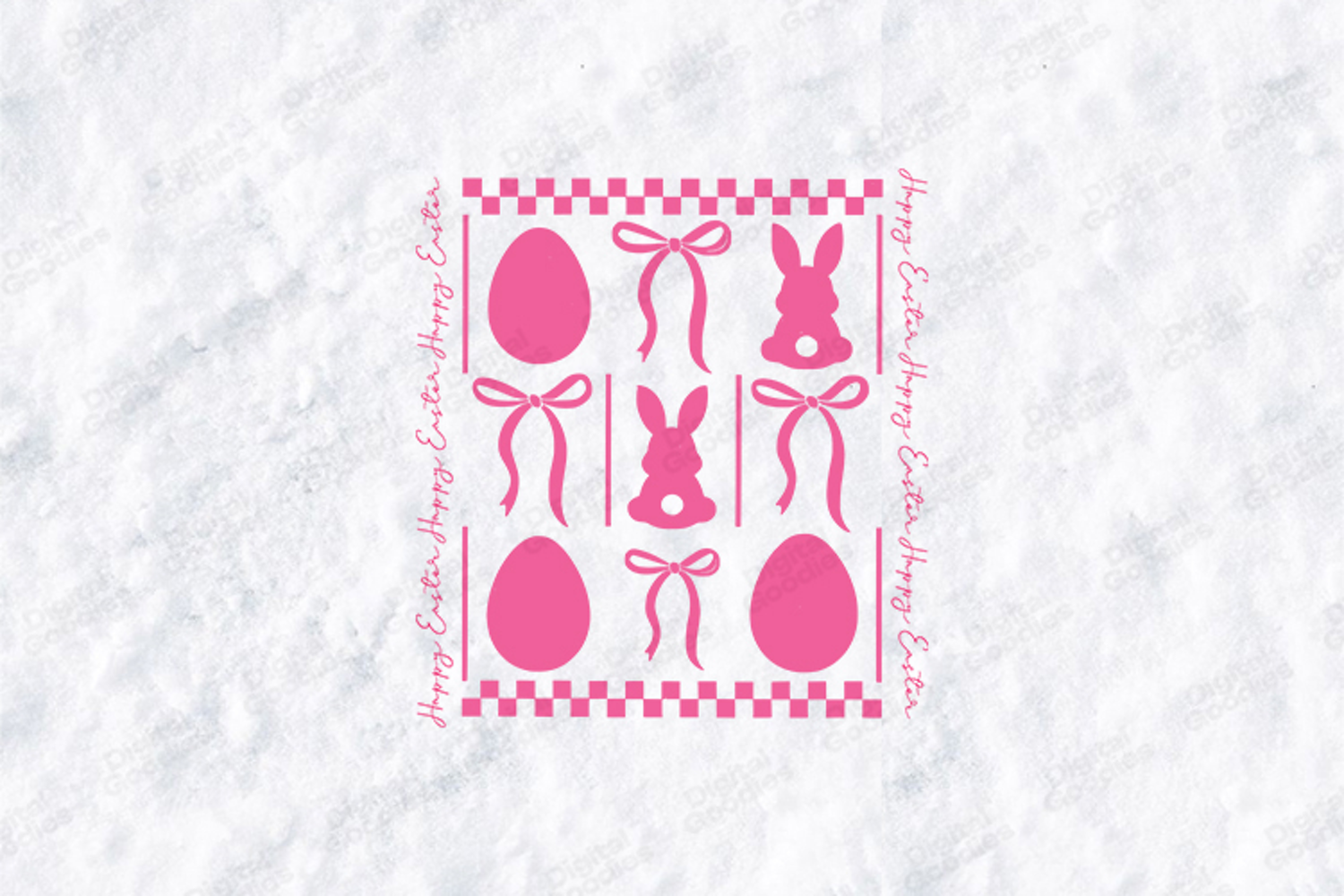 This high-quality digital illustration features a playful grid of pink bunny silhouettes, Easter eggs, and delicate coquette bows, framed by a classic checkerboard border. Accented with vertical "Happy Easter" typography, this design perfectly captures the popular "preppy" and "clean girl" aesthetics for your holiday projects.