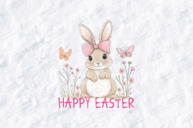 This high-quality digital illustration features a soft, wide-eyed bunny wearing a large pink coquette bow, surrounded by delicate wildflowers and fluttering butterflies. With its gentle watercolor textures and playful pink typography, this design is perfect for creators looking for a heartwarming, storybook feel for their holiday projects.