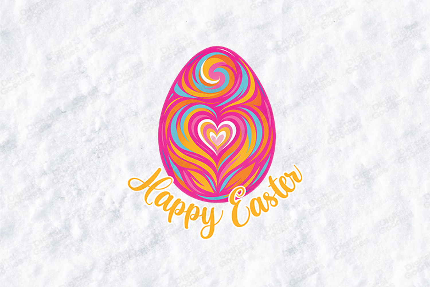 This high-quality digital illustration features a dynamic Easter egg silhouette filled with energetic swirls of pink, orange, and teal, centering around a delicate layered heart. Complemented by bold yellow "Happy Easter" typography, this design is perfect for creators looking to stand out with a bold and colorful aesthetic this holiday season.