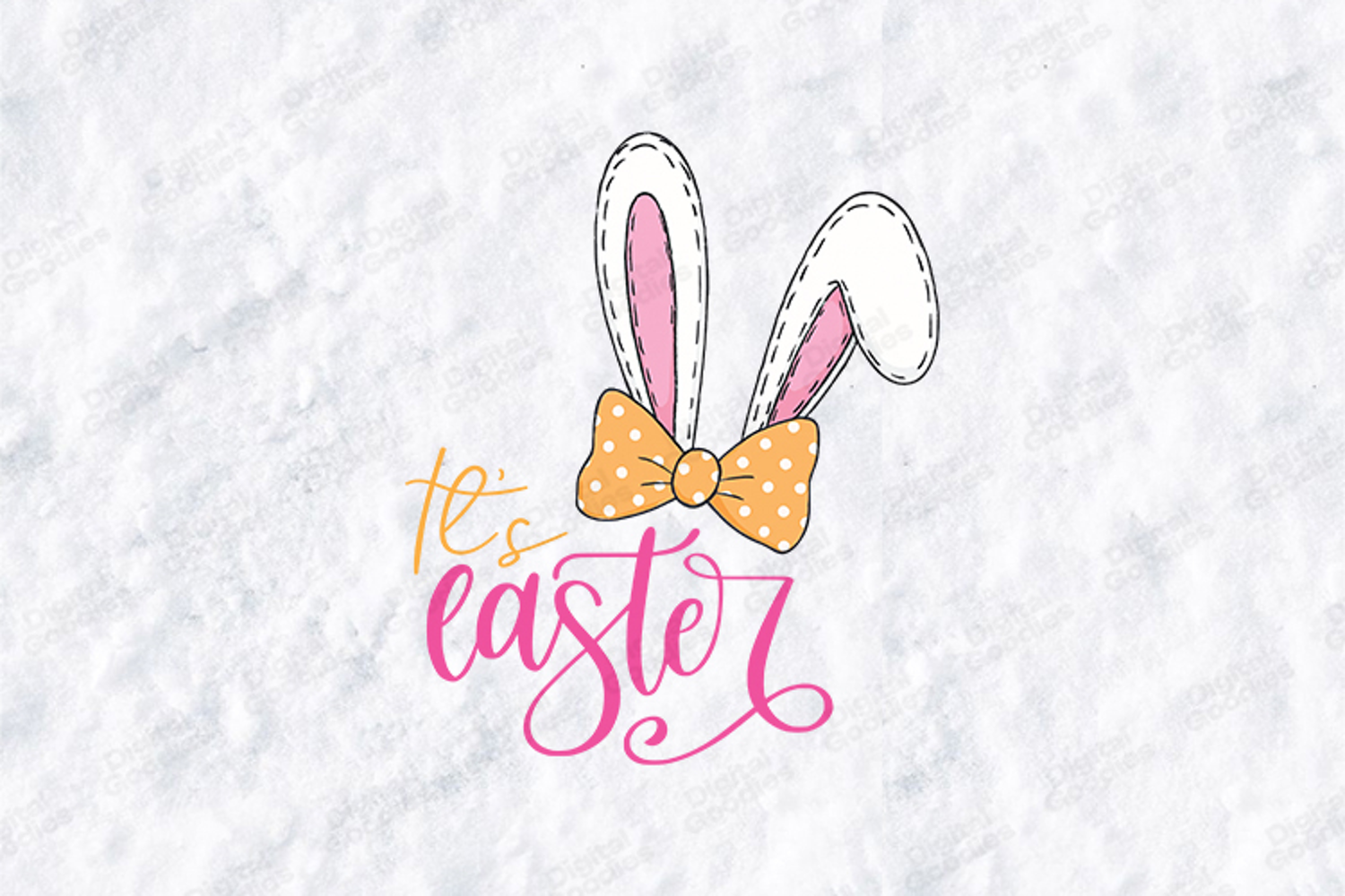 This high-quality digital illustration features a pair of cute, hand-drawn bunny ears with a unique "stitched" border detail. Adorned with a cheerful orange polka-dot bow and paired with elegant pink and gold script typography, this design is perfect for creators looking for a sweet, boutique-style look for their spring projects.