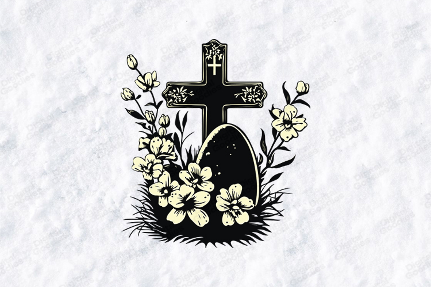Celebrate the true meaning of the season with this elegant Floral Cross and Easter Egg design. This high-contrast, detailed graphic features a decorative cross surrounded by blooming spring flowers and a classic Easter egg, making it perfect for religious holiday crafts.