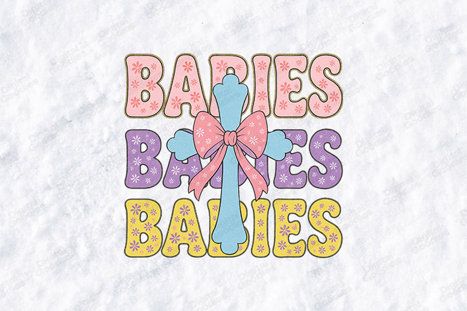 Celebrate the true meaning of the season with this Retro Floral Cross Easter Design! Featuring the word "Babies" in a groovy, floral-patterned font and a central light blue cross adorned with a pink polka-dot bow, this design perfectly blends traditional faith with modern "coquette" and "retro" trends.