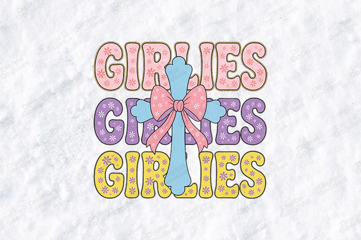 Celebrate faith with a trendy twist! This Retro "Girlies" Cross design features a charming coquette-style bow and vibrant, vintage-inspired typography. Perfect for creating custom sweatshirts, tote bags, or t-shirts for youth groups, Easter, or everyday wear.