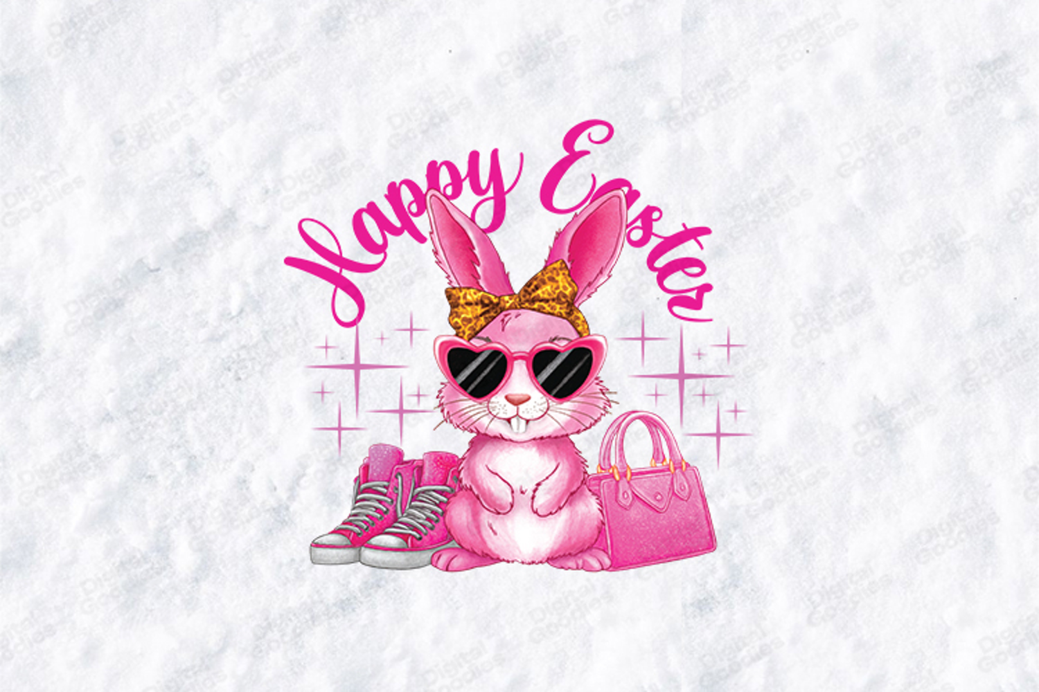 Add some serious style to your holiday crafts with this Preppy Pink Easter Bunny design! Featuring a sassy pink bunny with heart-shaped sunglasses, a trendy leopard print bow, sparkly high-top sneakers, and a matching handbag, this design is perfect for those who want a modern, fashionable twist on traditional Easter graphics.