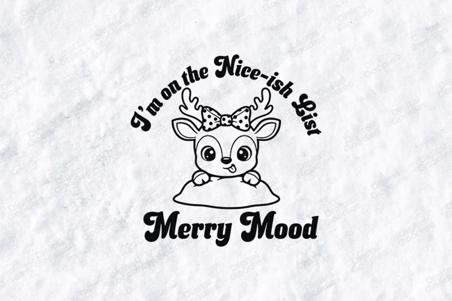 Add a touch of festive humor to your holiday projects with our "Merry Mood" Reindeer digital design. This high-quality graphic features a charming, peeking reindeer wearing a stylish polka-dot bow and showing a playful expression. Surrounded by the slogans "I'm on the Nice-ish List" and "Merry Mood," it’s the perfect blend of holiday sass and sweetness.