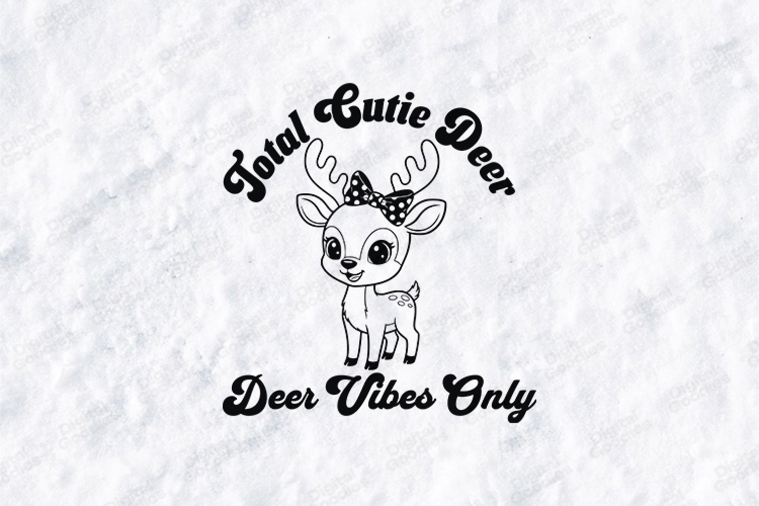 Add a touch of adorable woodland charm to your festive projects with our "Total Cutie Deer" digital design. This high-quality graphic features a sweet, wide-eyed baby reindeer wearing a stylish polka-dot bow and a friendly smile. Framed by the playful slogans "Total Cutie Deer" and "Deer Vibes Only," it is the perfect blend of modern nursery aesthetics and classic Christmas spirit.