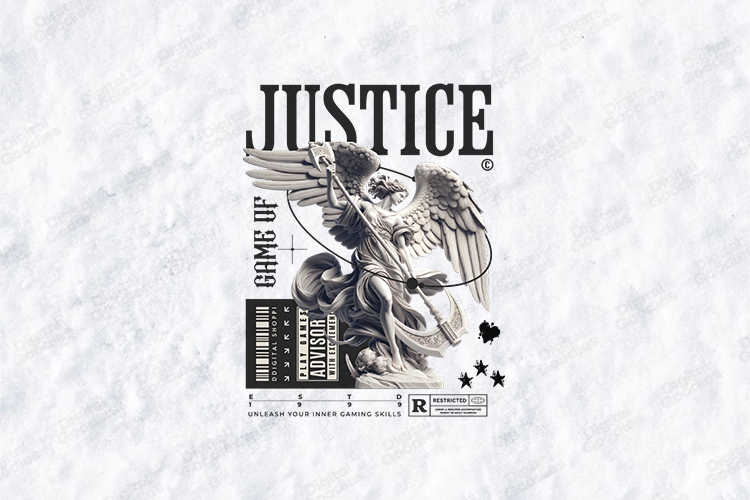 Elevate your apparel collection with this sophisticated, high-end gaming design. Featuring a stunning, classically-inspired winged angel statue wielding a celestial staff, this "Justice" graphic blends timeless Greek aesthetics with modern urban streetwear vibes. It is the perfect statement piece for gamers who appreciate art, mythology, and luxury design.