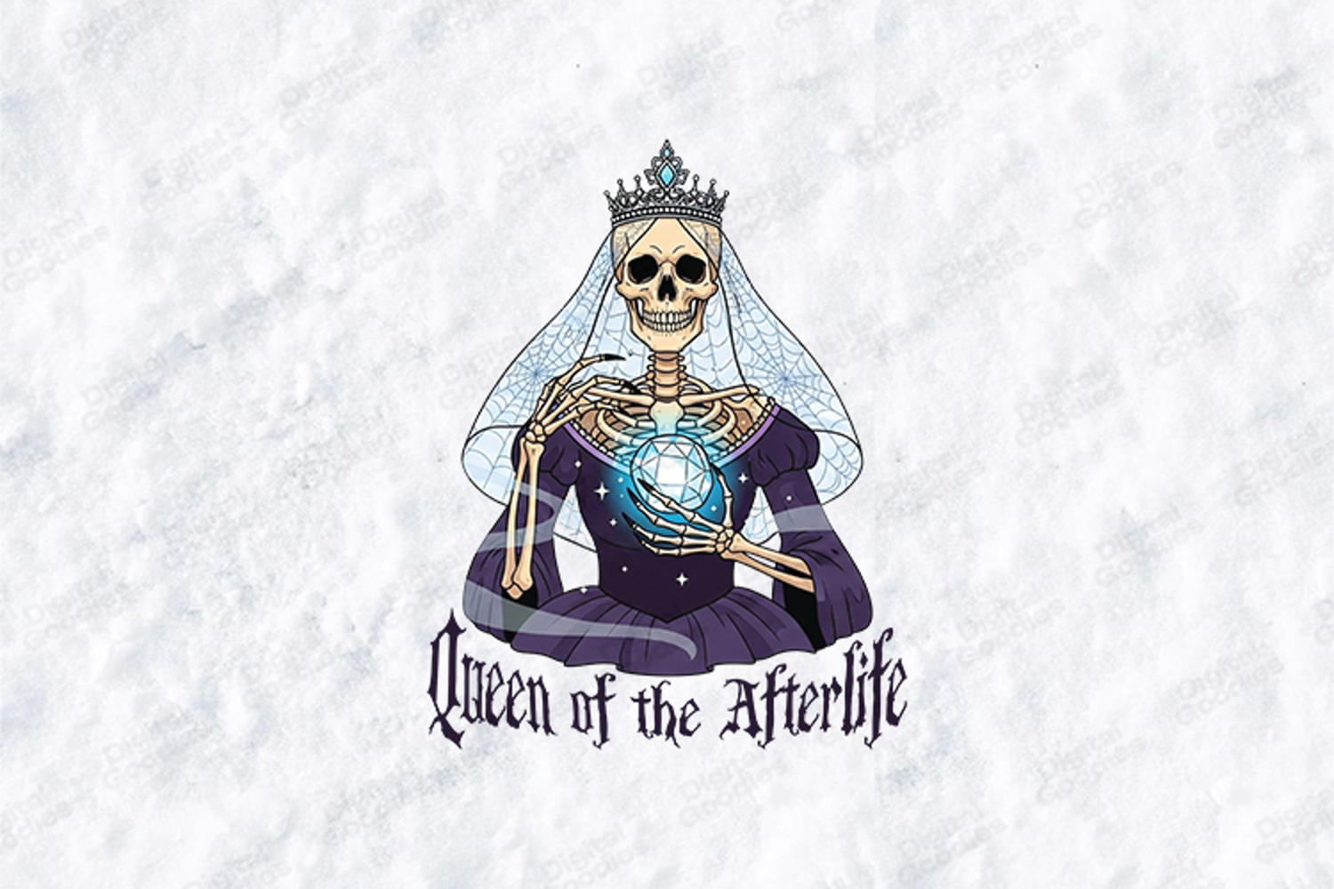 Claim your throne in the beyond with the "Queen of the Afterlife" gothic design. This high-quality digital illustration features an exquisitely detailed aesthetic that blends dark royalty with mystical sorcery, making it perfect for creating professional-grade apparel and atmospheric seasonal decor.