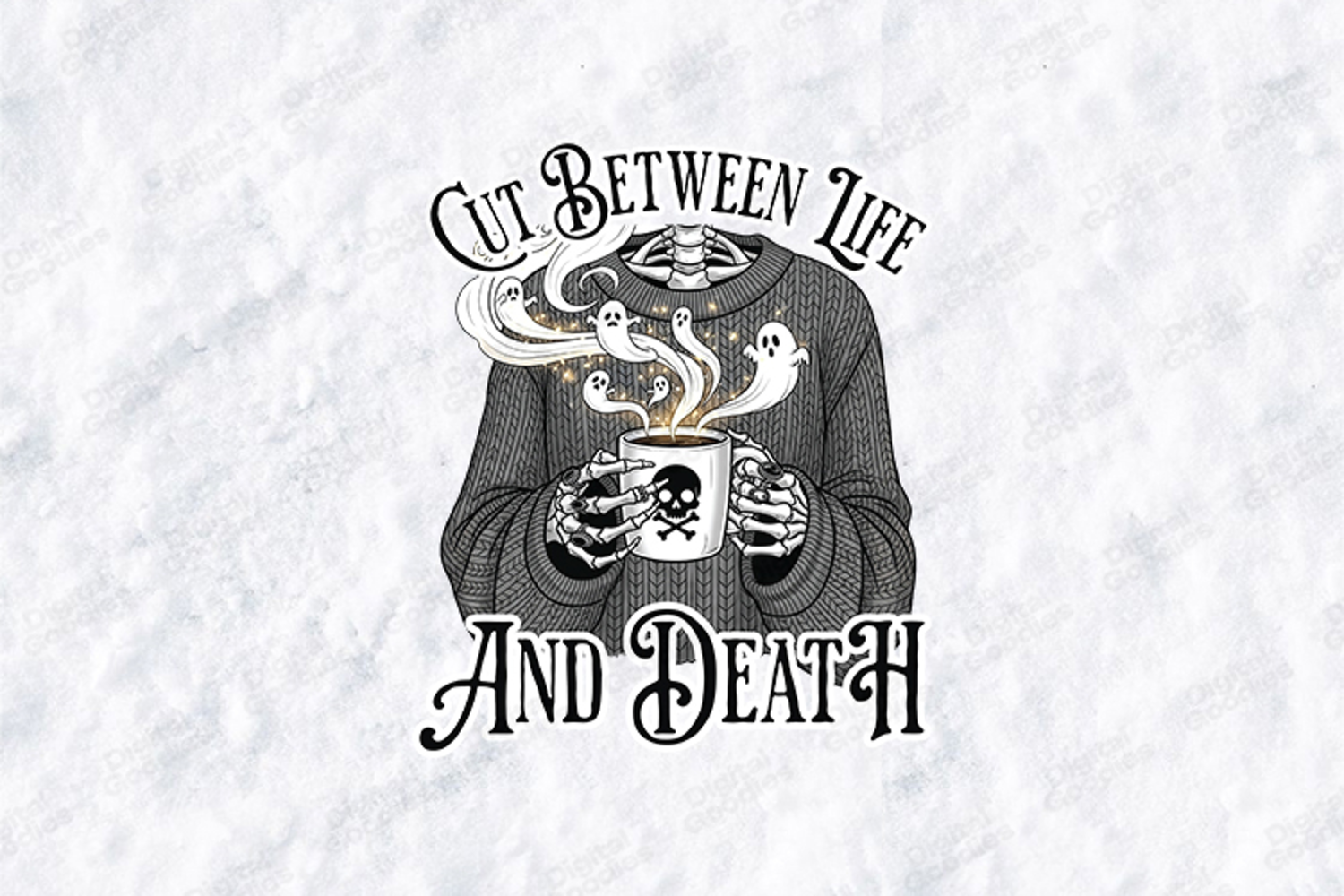 Find your balance in the supernatural brew with the "Cut Between Life And Death" design. This high-quality digital illustration features a masterfully detailed aesthetic that blends dark academia with classic Halloween "cozy horror," perfect for creating professional-grade apparel and atmospheric seasonal decor.