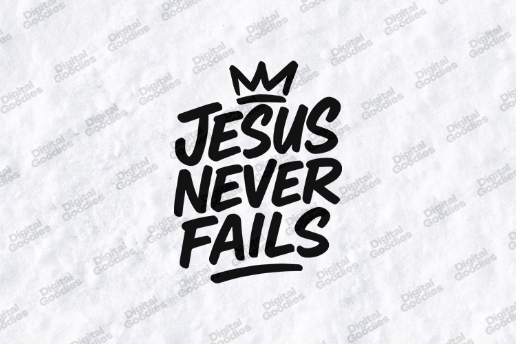 Proclaim your unwavering trust with the bold "Jesus Never Fails" religious design. This high-quality digital illustration features a clean, high-contrast aesthetic, perfect for creating professional-grade apparel, inspirational church gifts, and impactful home decor.