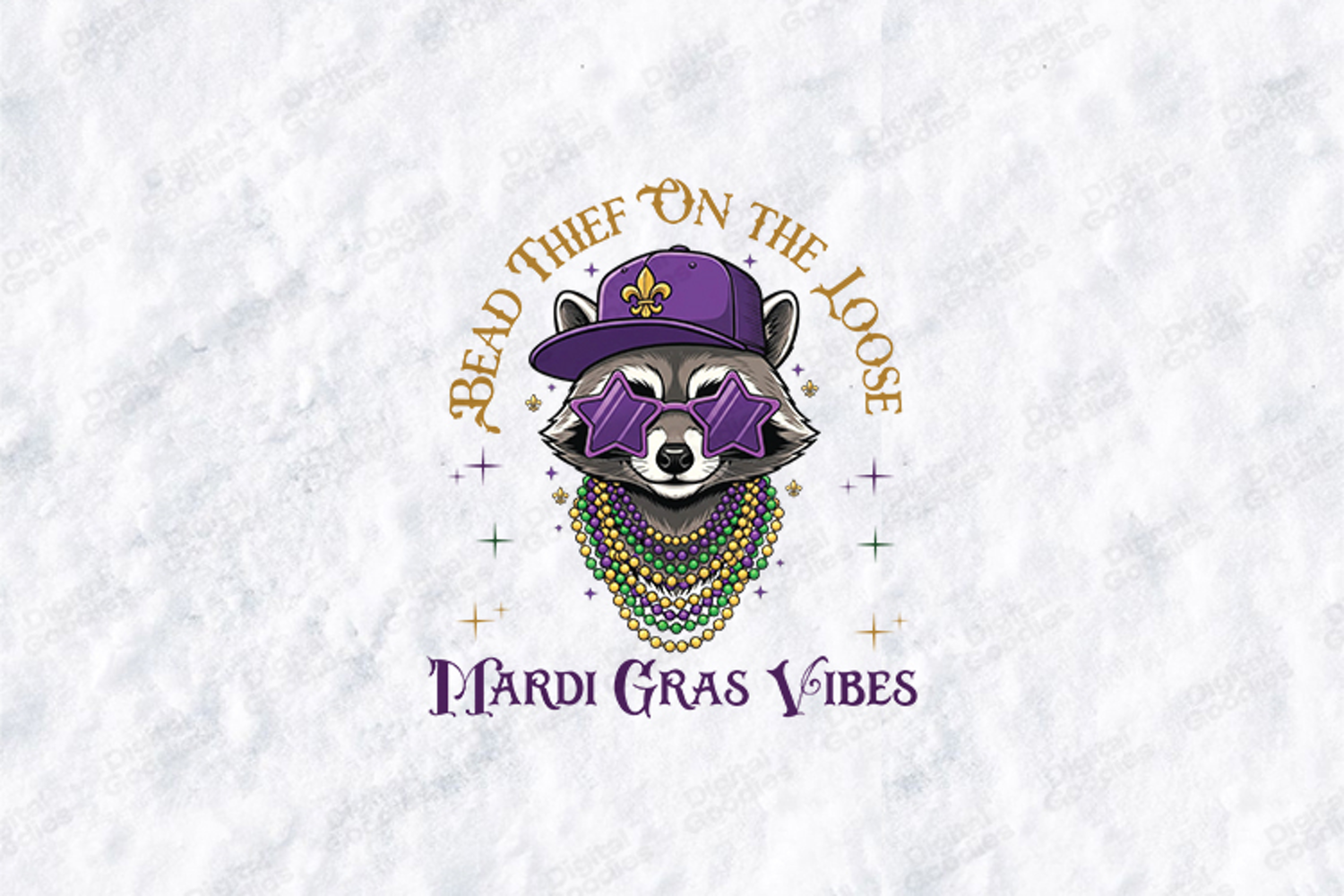Add some humor to your Carnival creations with the "Bead Thief On The Loose" digital design. This high-resolution graphic features a cool raccoon rocking star-shaped sunglasses, a purple fleur-de-lis cap, and layers of festive beads. Perfect for creating funny t-shirts, party favors, and "Mardi Gras Vibes" accessories, this versatile SVG/PNG is a must-have mascot for your holiday crafting projects.