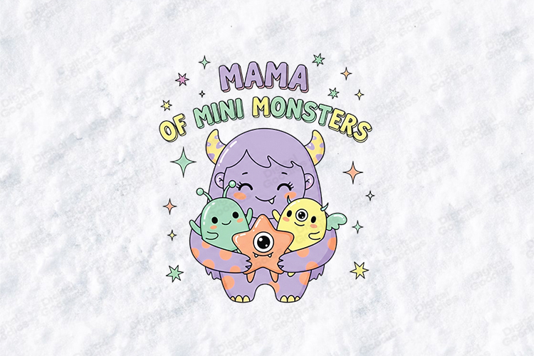 Embrace the playful chaos of parenting with the "Mama of Mini Monsters" digital design. This high-resolution graphic features a gentle purple mother monster cuddling three adorable "mini monsters" in shades of green, yellow, and orange. Surrounded by twinkling pastel stars, this versatile SVG/PNG is perfect for creating fun t-shirts for moms, whimsical nursery wall art, and personalized gifts for the mama who handles her little monsters with love.