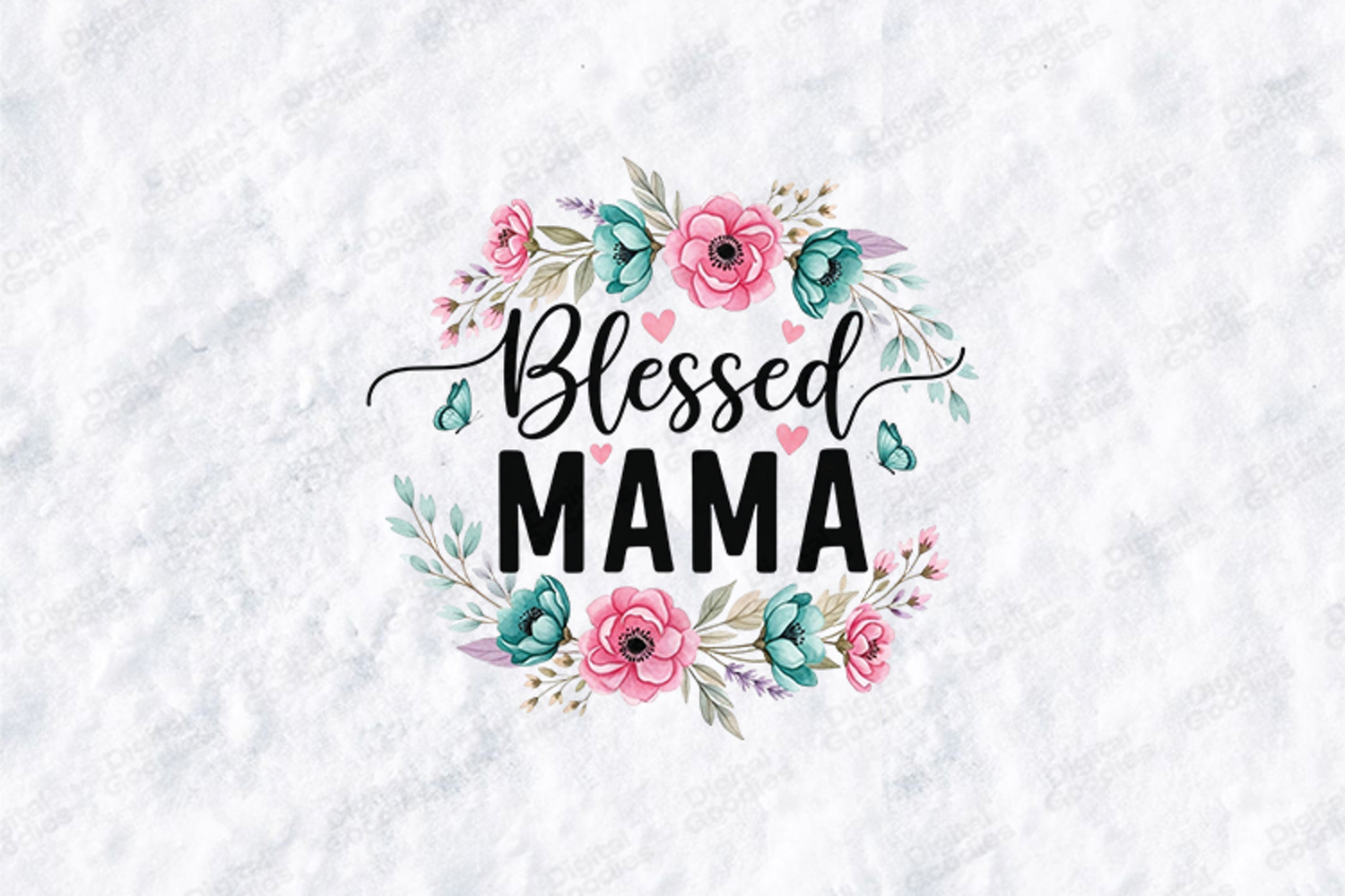 Celebrate the elegance of motherhood with the "Blessed Mama" digital design. This high-resolution graphic features a lush circular wreath of vibrant pink and teal roses, accented by soft greenery, lavender sprigs, and charming butterflies and hearts. This versatile SVG/PNG is perfect for creating heartwarming t-shirts, elegant nursery wall decor, personalized Mother's Day cards, and beautiful gifts for the blessed mama in your life.