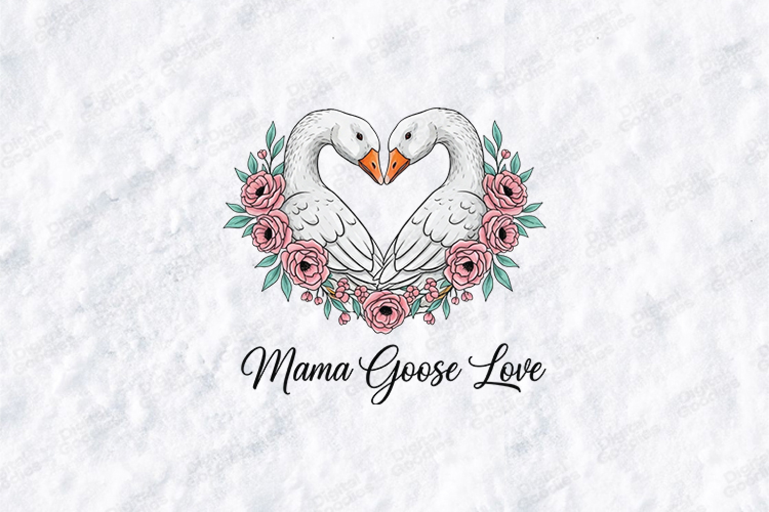 Celebrate the tender bond of family with the "Mama Goose Love" digital design. This high-resolution graphic features two graceful white geese forming a perfect heart shape with their necks, nestled within a lush wreath of pink roses and soft greenery. This versatile SVG/PNG is perfect for creating heartwarming t-shirts, elegant nursery wall decor, personalized Mother’s Day cards, and beautiful gifts that capture the spirit of maternal love