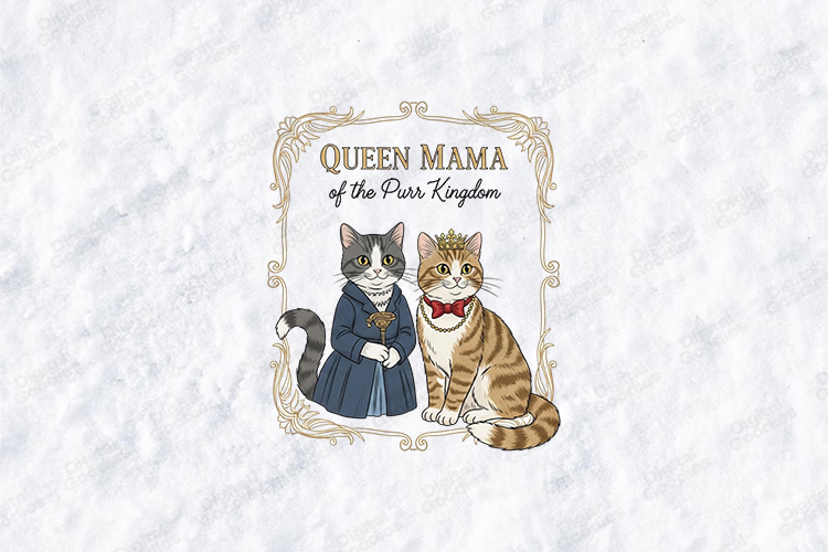 Crown your creativity with the "Queen Mama of the Purr Kingdom" digital design. This high-resolution graphic features two sophisticated felines—a tuxedo cat in a royal blue gown and a ginger tabby adorned with a golden crown and red bowtie—framed by an elegant golden border. This versatile SVG/PNG is perfect for creating high-end t-shirts, Victorian-style home decor, and personalized gifts for the queen of any cat-loving household.