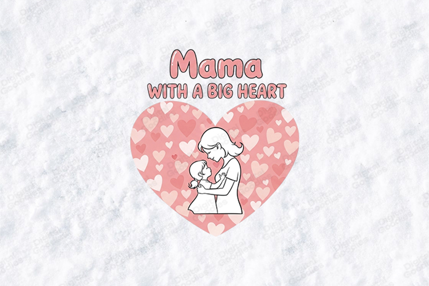 Celebrate the unconditional bond of family with the "Mama With A Big Heart" digital design. This high-resolution graphic features a clean line-art illustration of a mother embracing her daughter, set against a large heart filled with soft pink and peach heart patterns. This versatile SVG/PNG is perfect for creating heartwarming t-shirts, modern nursery wall art, and personalized gifts for the mama who truly has a big heart.