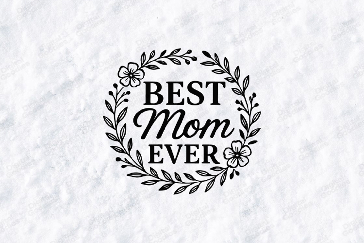 Honor the most special woman in your life with the circular "Best Mom Ever" digital design. This high-resolution graphic features elegant, bold black-and-white typography enclosed within a delicate, hand-drawn wreath of leafy branches and dainty flowers. This versatile SVG/PNG is perfect for creating sophisticated t-shirts, modern home decor, and personalized Mother's Day gifts for the mom who deserves the absolute best.