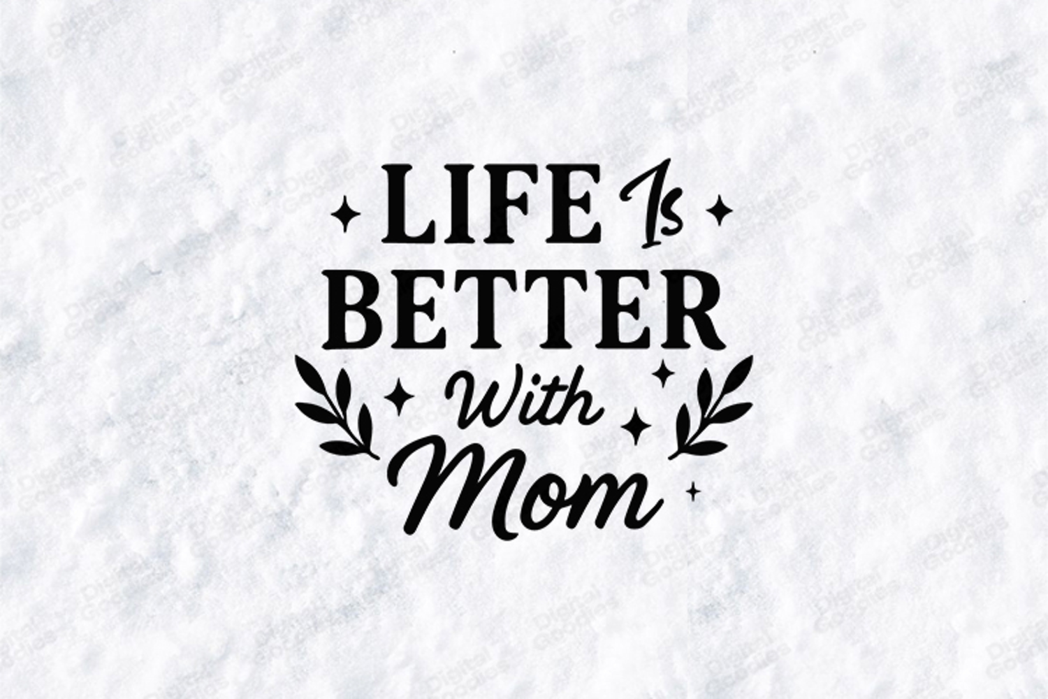 Celebrate the simple truth of family with the "Life Is Better With Mom" digital design. This high-resolution graphic features clean, bold black-and-white typography accented by elegant leafy sprigs and twinkling celestial stars. This versatile SVG/PNG is perfect for creating modern t-shirts, sophisticated home decor, and heartfelt gifts that honor the joy a mother brings to everyday life.