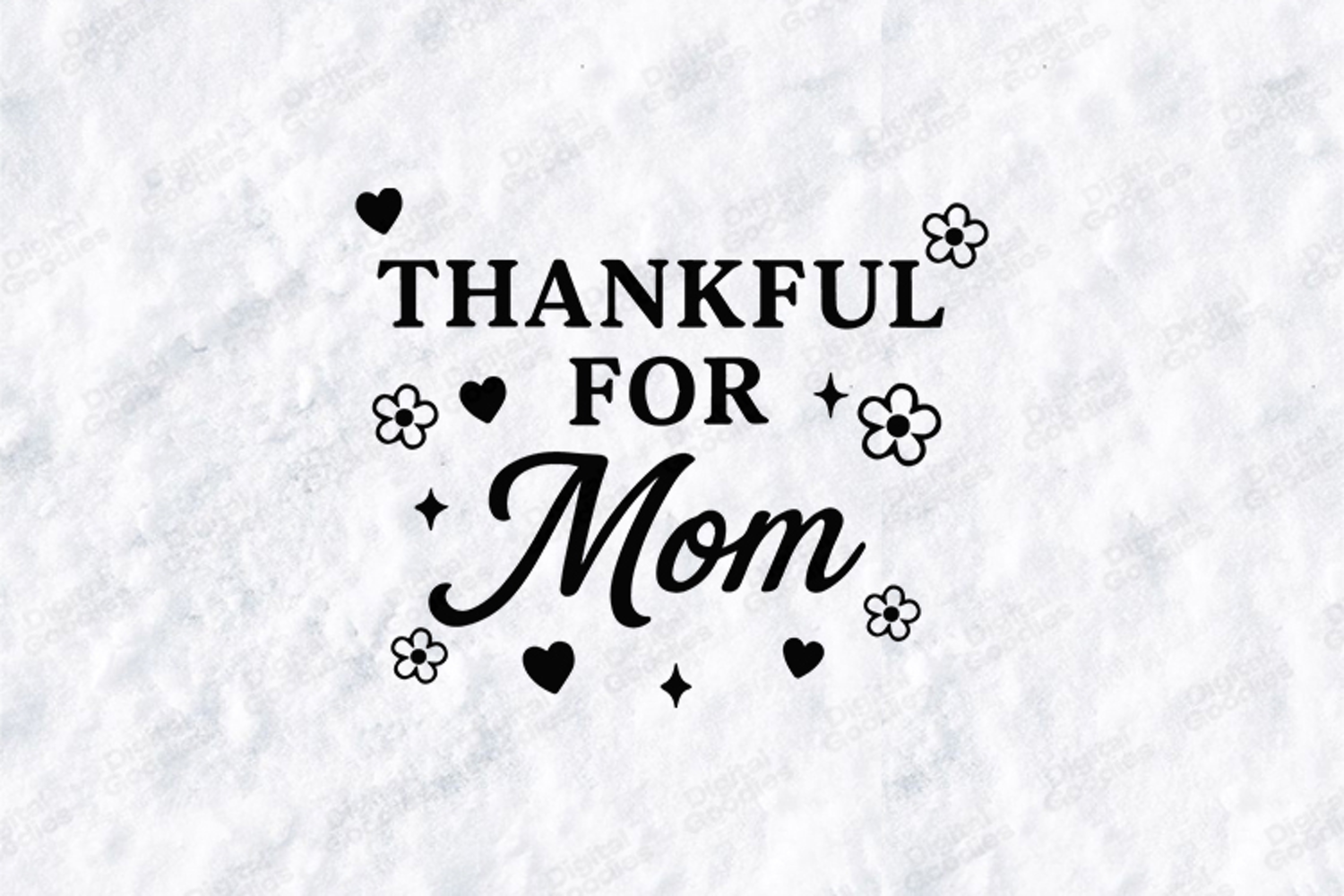 Show your gratitude with the "Thankful For Mom" digital design. This high-resolution graphic features a classic blend of bold and script black-and-white typography, playfully accented by cheerful daisy blossoms, sweet hearts, and twinkling celestial stars. This versatile SVG/PNG is perfect for creating modern t-shirts, heartwarming home decor, and personalized gifts that tell Mom exactly how much she is cherished.