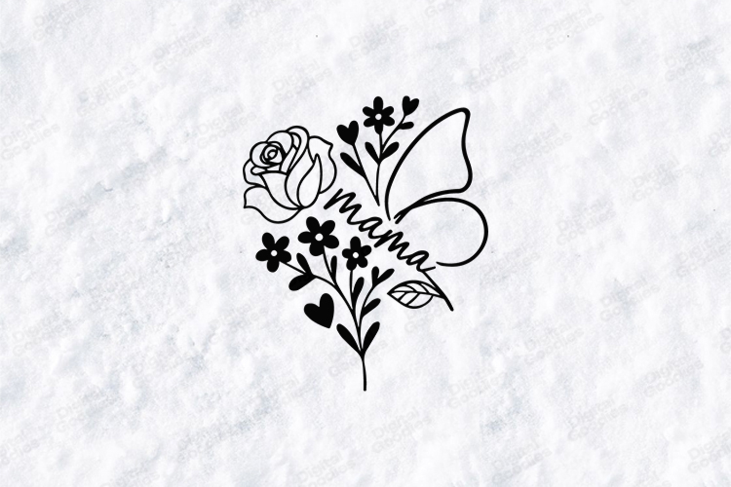 This high-quality digital illustration features a graceful botanical aesthetic, perfect for mothers who find inspiration in nature and growth. The design showcases the word "mama" in an elegant, flowing script, beautifully integrated into a heart-shaped floral arrangement. The composition features a large, intricately detailed rose, various wildflowers, and delicate leaf stems that seamlessly transition into the wings of a butterfly. This high-contrast monochrome artwork is an ideal choice for creating professional t-shirts, personalized garden tote bags, and sophisticated home decor.