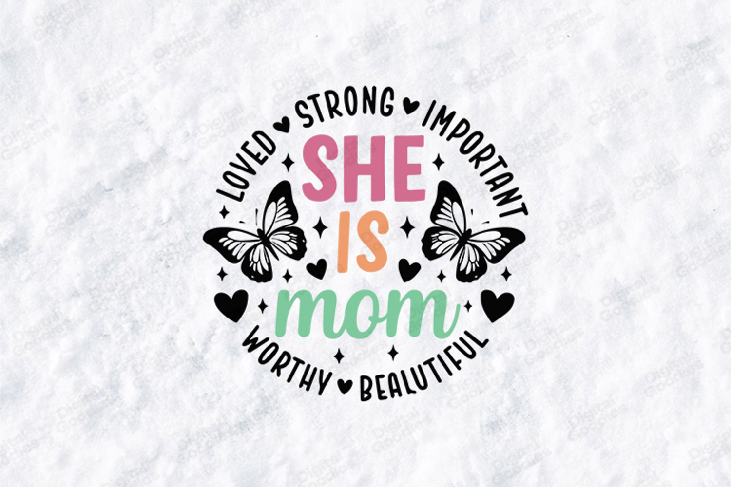 This high-quality digital illustration features a modern, colorful aesthetic designed to honor the strength and beauty of mothers everywhere. The design showcases the phrase "SHE IS mom" in a playful combination of bold pink block lettering, orange serif accents, and a soft green script. The central text is flanked by two detailed, symmetrical butterflies and framed by a circular border of powerful affirmations, including "LOVED," "STRONG," "IMPORTANT," "WORTHY," and "BEAUTIFUL". Accented with twinkling stars and solid hearts, this cheerful artwork is an ideal choice for creating high-impact t-shirts, personalized journals, and uplifting home decor.