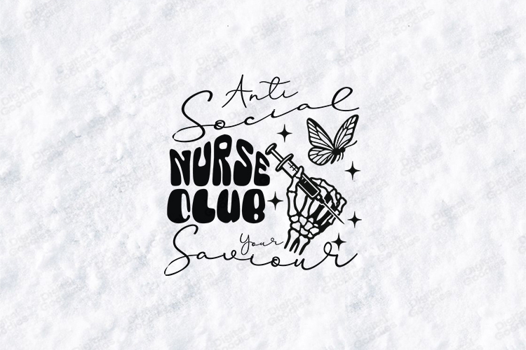 This high-quality digital illustration features a modern, gothic medical aesthetic, perfect for nurses and medical professionals who balance their life-saving work with a touch of introverted humor. The design showcases a detailed skeleton hand firmly grasping a medical syringe, beautifully contrasted by a delicate butterfly fluttering nearby. The composition features the phrase "Anti Social NURSE CLUB Your Saviour" in a striking mix of elegant, flowing script and bold, wavy display fonts. Accented with twinkling stars, this high-contrast monochrome artwork is an ideal choice for creating high-impact nursing t-shirts, personalized hospital tote bags, and stylish medical-themed stickers.