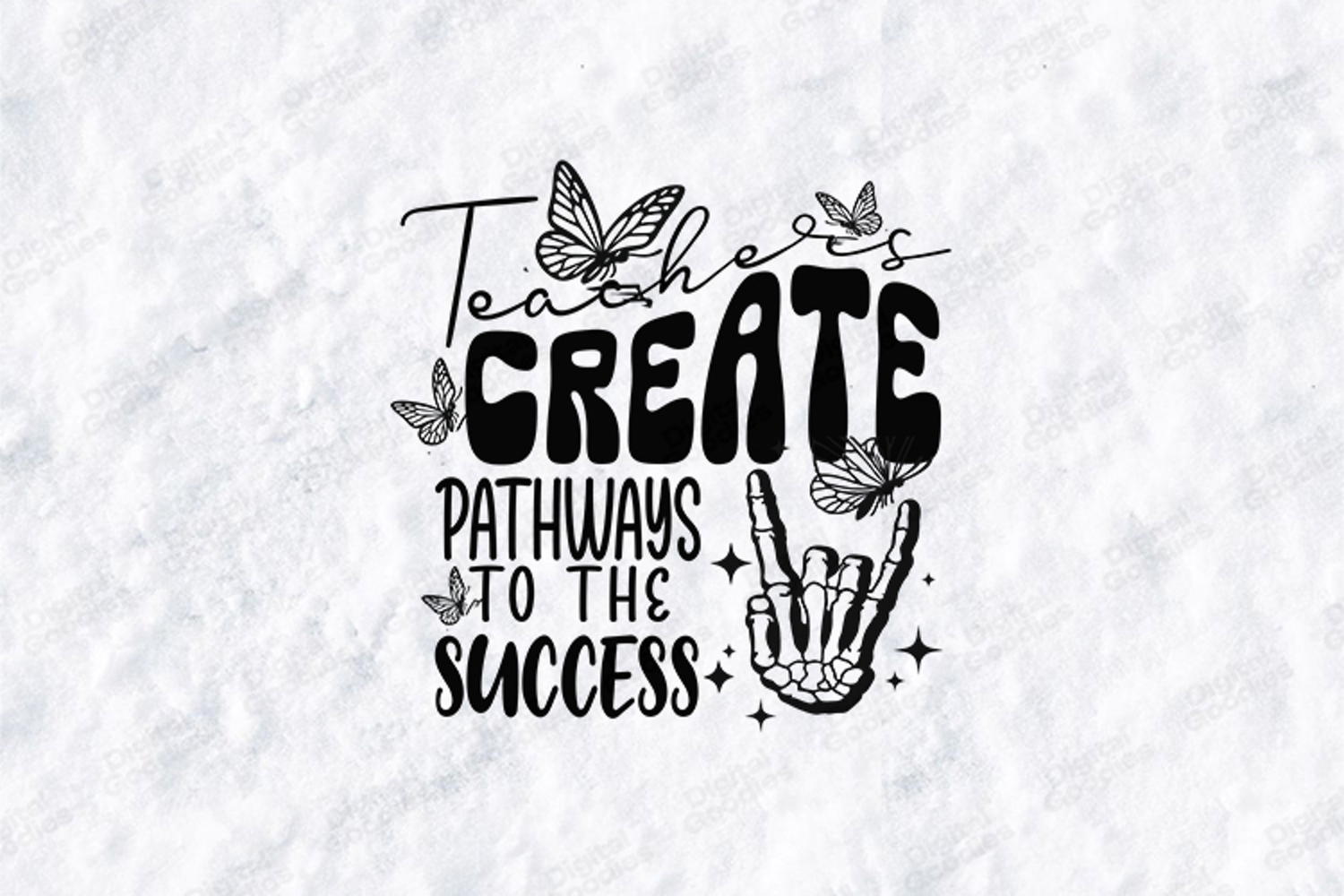 This high-quality digital illustration features a trendy, artistic aesthetic perfect for educators who lead with style and passion. The design showcases the phrase "Teachers CREATE PATHWAYS TO THE SUCCESS" in a striking combination of elegant script and bold, retro-inspired bubble typography. It is creatively accented with a detailed skeleton hand making a "rock on" sign, surrounded by delicate butterflies and twinkling star details. This high-contrast black-and-white artwork is an ideal choice for creating high-impact t-shirts, personalized tote bags, and unique classroom decor.