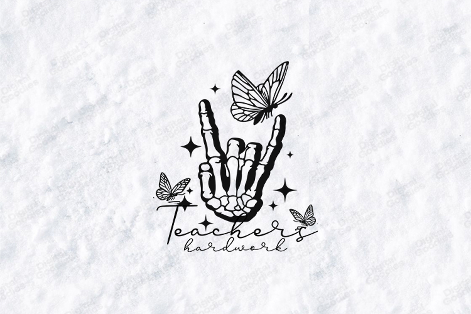 This high-quality digital illustration features a modern, trend-forward aesthetic perfect for teachers who lead with both strength and grace. The design showcases a detailed skeleton hand making a "rock on" sign, serving as a perch for a beautifully rendered butterfly. Surrounded by twinkling star accents and additional butterflies, the layout is anchored by the phrase "Teachers hardwork" in a minimal and elegant script typography. This high-contrast black-and-white artwork is an ideal choice for creating high-impact t-shirts, unique teacher planners, and modern classroom decor.