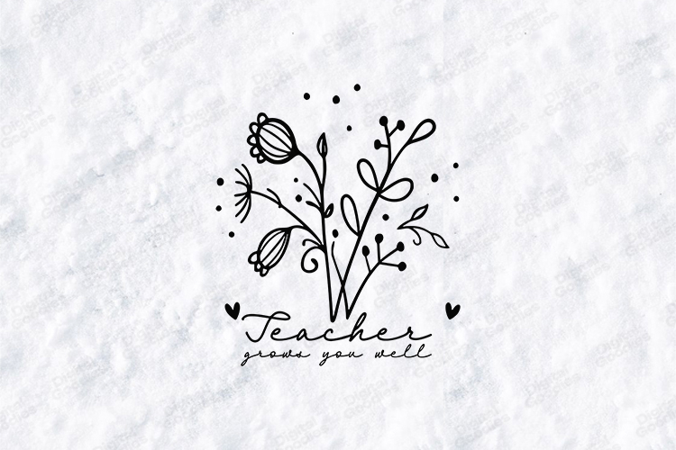 This high-quality digital illustration features a whimsical and organic aesthetic, perfect for teachers who dedicate themselves to helping their students flourish. The design showcases a hand-drawn bouquet of wildflowers and botanical stems, accented by playful dots that suggest a sprinkling of knowledge. Anchored by the graceful phrase "Teacher grows you well" in an elegant script font and framed by tiny hearts, this monochrome artwork is an ideal choice for creating high-impact t-shirts, personalized tote bags, and sophisticated classroom decor.