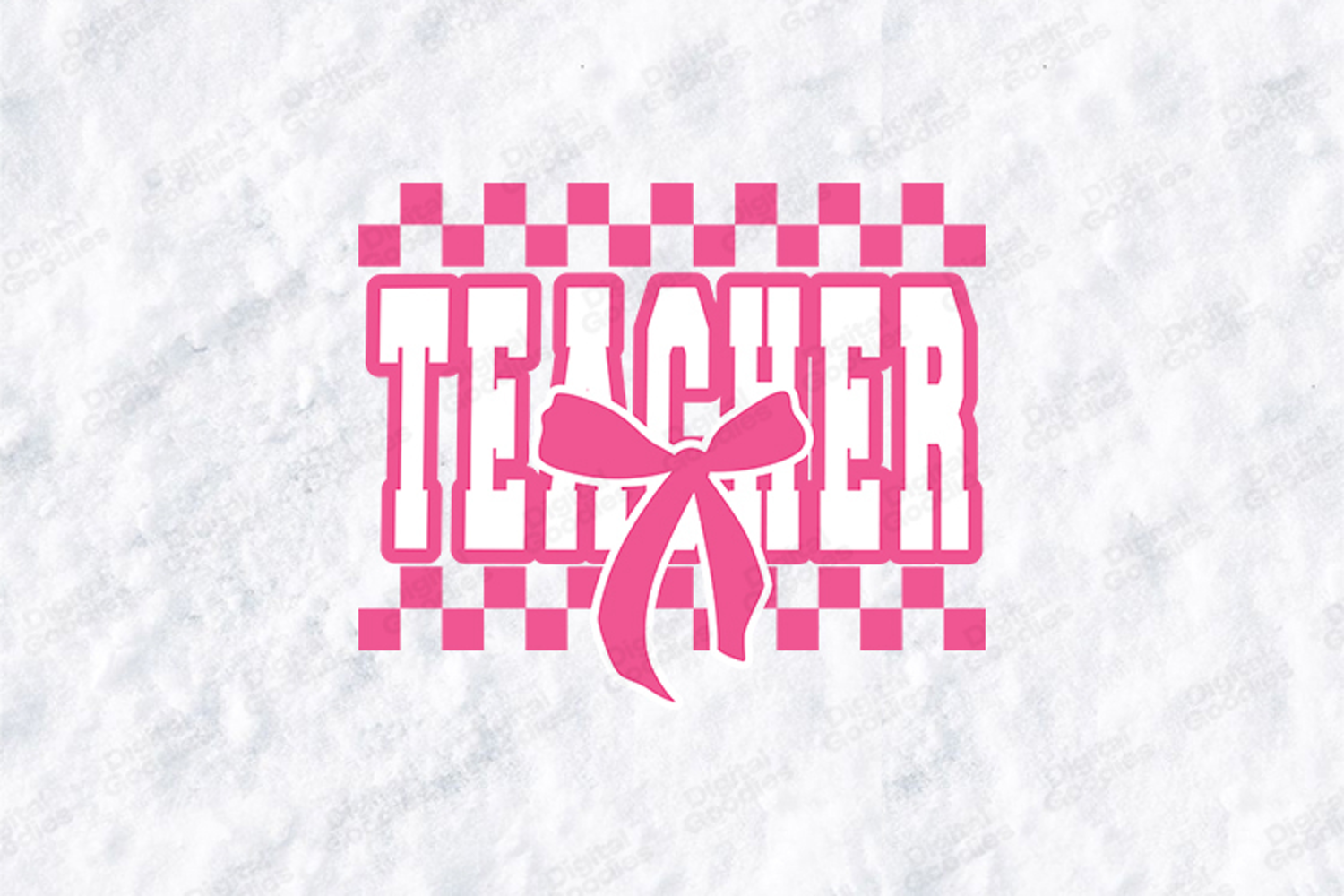 This high-quality digital illustration features a modern coquette aesthetic, perfect for educators and school staff who love a stylish flair. The design showcases the word "TEACHER" in bold, athletic-style block lettering with a vibrant pink outline. It is creatively accented with a large, graceful pink bow at the center and framed by matching pink and white checkered patterns at the top and bottom. This striking pink monochrome artwork is an ideal choice for creating high-impact school t-shirts, personalized educator tote bags, and trendy classroom stickers.