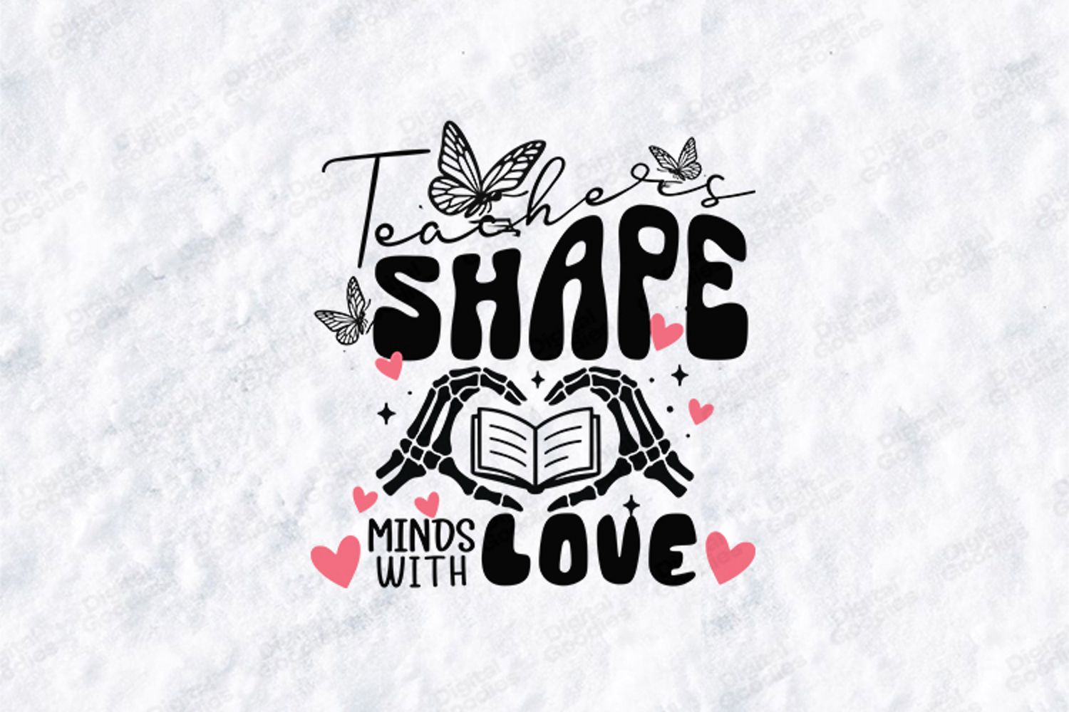 This high-quality digital illustration features a striking modern aesthetic, blending sentimental teacher appreciation with trendy anatomical and butterfly imagery. The design showcases the powerful message "Teachers Shape Minds With Love" in a mix of elegant script and bold, retro-style typography. At the center, two detailed skeleton hands form a protective heart shape around an open book, accompanied by delicate butterflies and whimsical pink heart accents. This black-and-white artwork with soft pink details is an ideal choice for creating high-impact t-shirts, personalized tote bags, and unique classroom decor.